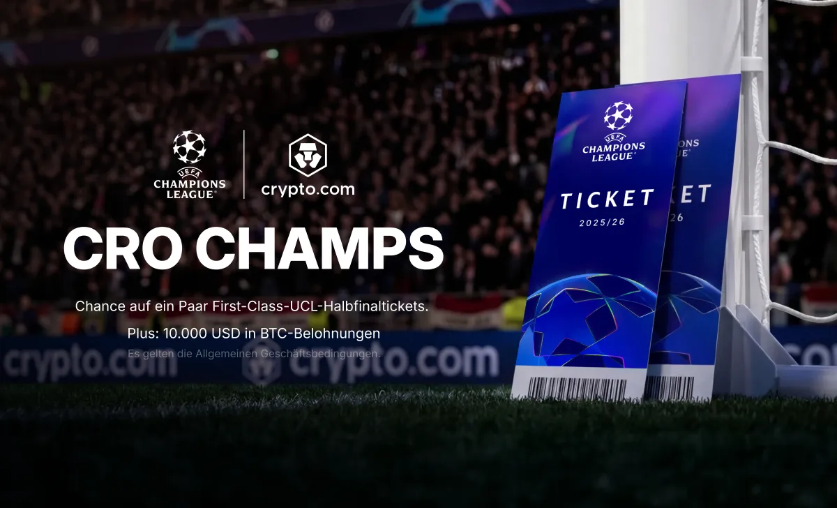 Bis zum 8. April belohnen wir alle Trader, die früh durchstarten und groß einsteigen: Die Top 500 CRO-Trader gewinnen BTC-Prämien – und zwei Trader aus dem EWR sichern sich exklusive First-Class-Tickets für ein UEFA Champions League Halbfinale.