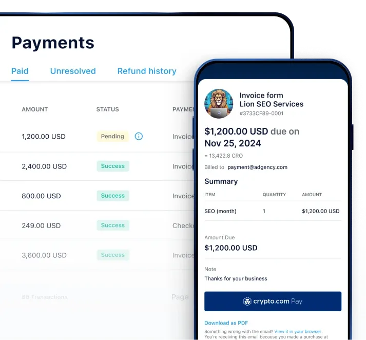 Choose from one-time or recurring crypto payments from Crypto.com users.*