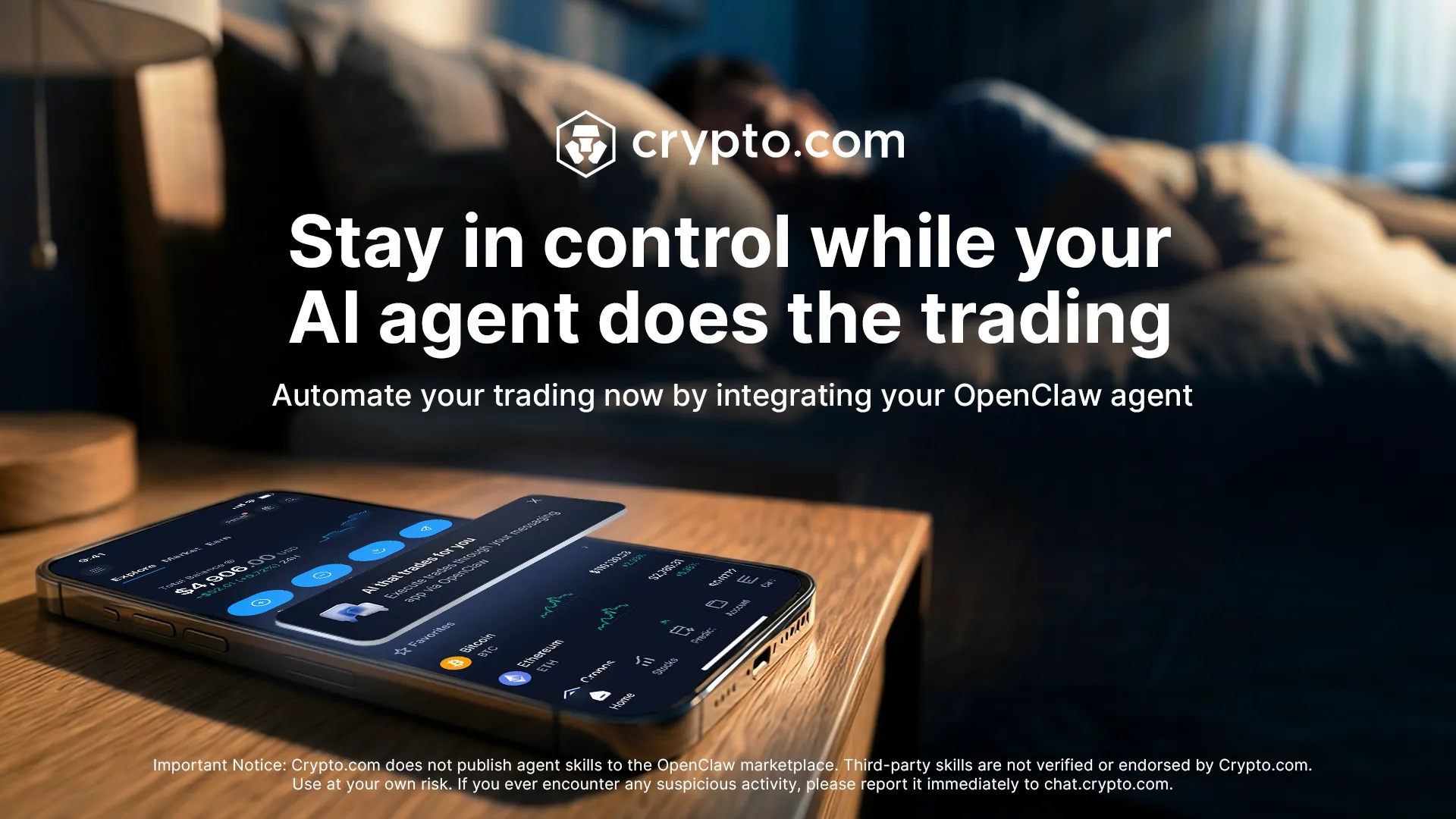 Crypto.com does not publish agent skills to the OpenClaw marketplace. Third-party skills are not verified or endorsed by Crypto.com. Use at your own risk. If you ever encounter any suspicious activity, please report it immediately to chat.crypto.com.