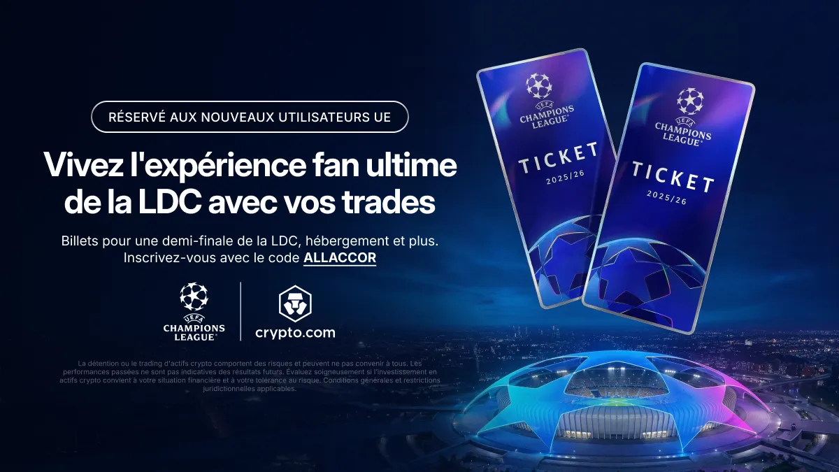 - Cette campagne est promue par Foris DAX MT. Foris DAX MT Limited est une société à responsabilité limitée immatriculée à Malte sous le numéro C 88392, dont le siège social est situé Level 7, Spinola Park, Triq Mikiel Ang Borg, SPK 1000, St. Julians, Malte, opérant sous le nom Crypto.com, dûment autorisée par la Malta Financial Services Authority en tant que prestataire de services sur actifs numériques conformément au Règlement 2023/1114 sur les marchés des crypto-actifs, tel qu’appliqué à Malte par le Markets in Crypto Assets Act.