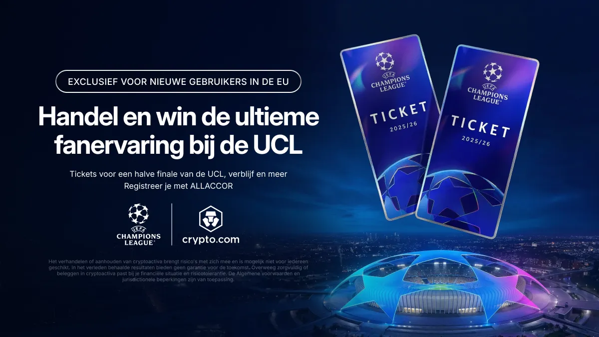 - Deze informatie is geen financieel advies. Dit is geen uitnodiging, aanbeveling, goedkeuring of aanbod van Crypto.com om te investeren, kopen of verkopen in digitale activa. Het kopen van cryptovaluta brengt aanzienlijke risico’s met zich mee, waaronder het verlies van (een groot deel van) uw inleg. Raadpleeg een professional voordat u financiële, beleggings- of handelsbeslissingen neemt.