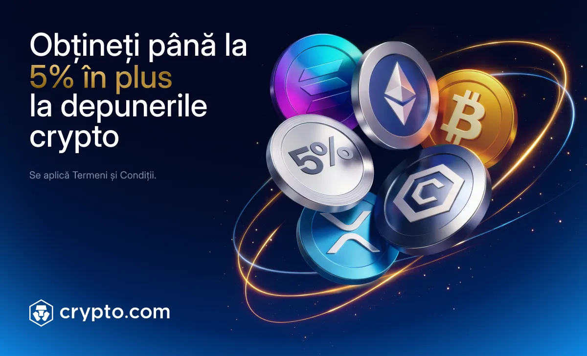 În premieră, fiecare depunere eligibilă de crypto pe Aplicația Crypto.com vă oferă șansa de a primi până la un bonus de 5% în CRO. Reguli Specifice Campaniei:
